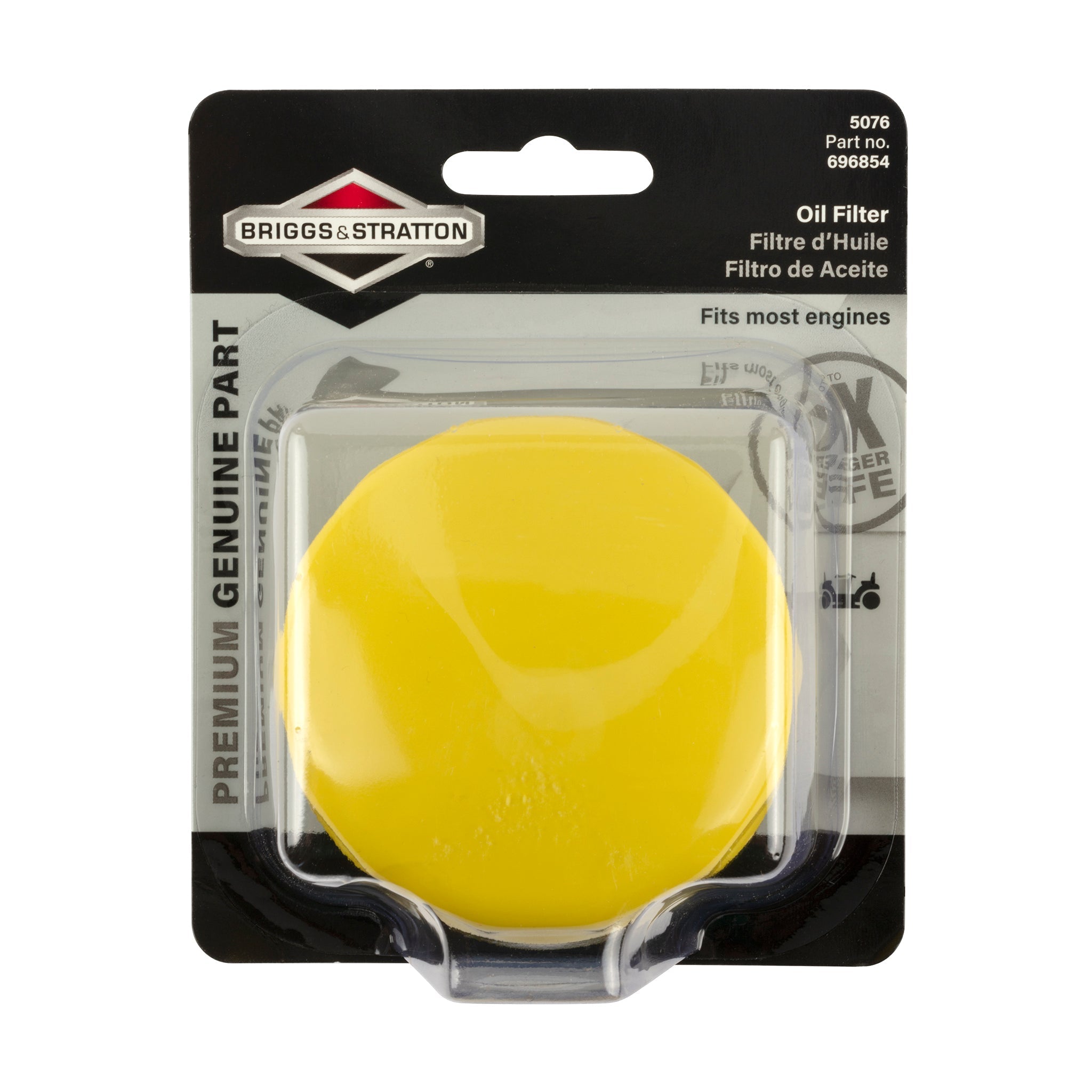 Display pack of 1 (696854) oil filter.This genuine parthelps to remove harmful contaminants from engine oil. Used on select Briggs and Stratton pressure-lubricated engines, this OEM part ensures proper fit and performance to maintain the life of your Briggs and Stratton engine. Many parts look similar, so it’s crucial to ensure you’re choosing the right replacement for your original equipment or engine model. Not sure? Use our Parts Lookup Tool to view part diagrams and find the correct replacement.