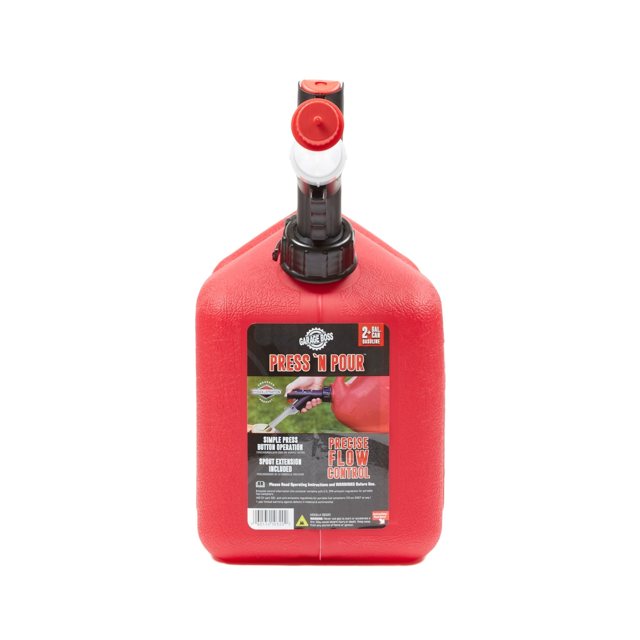 Garage Boss Press 'N Pour 2+ Gallon Fuel Filling System is the perfect solution to keep your small to medium size gas powered equipment running year round or to mix your 2 cycle oil. Whether it be your lawn mower, snow blower or leaf blower, the ergonomically friendly design makes fueling your equipment easy and clean. The EPA and Carburetor compliant spout and container includes a child safe cap and prevents fumes from escaping, as well as unnecessary spills. Along with the new easy to use Press 'n Pour spout, is the newly added Flame Mitigation Device (FMD). Many parts look similar, so it’s crucial to ensure you’re choosing the right replacement for your original equipment or engine model. Not sure? Use our Parts Lookup Tool to view part diagrams and find the correct replacement.
